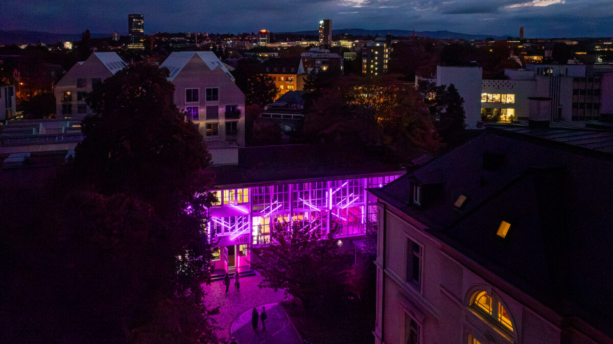 On the outside, the coloured lighting fixtures of the media facade are located in the covered vestibule of the glass facade, which is characterised by vertical and horizontal beams. They were installed diagonally to this grid in such a way that they playfully reflect the visual structure of the MDPI customer logo.