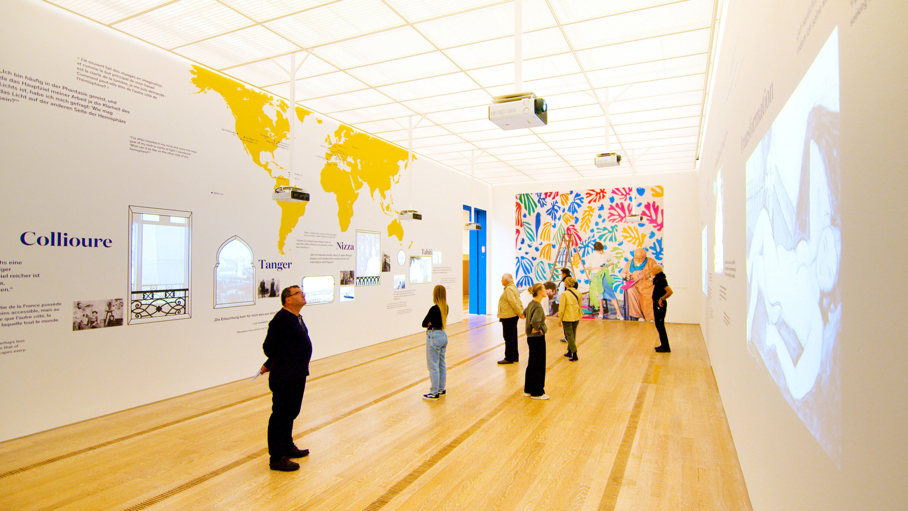 Der Vermittlungsraum zur Ausstellung «Matisse – Einladung zur Reise» in der Fondation Beyeler überzeugt durch die präzise Kombination virtueller und gedruckter Wandelemente.